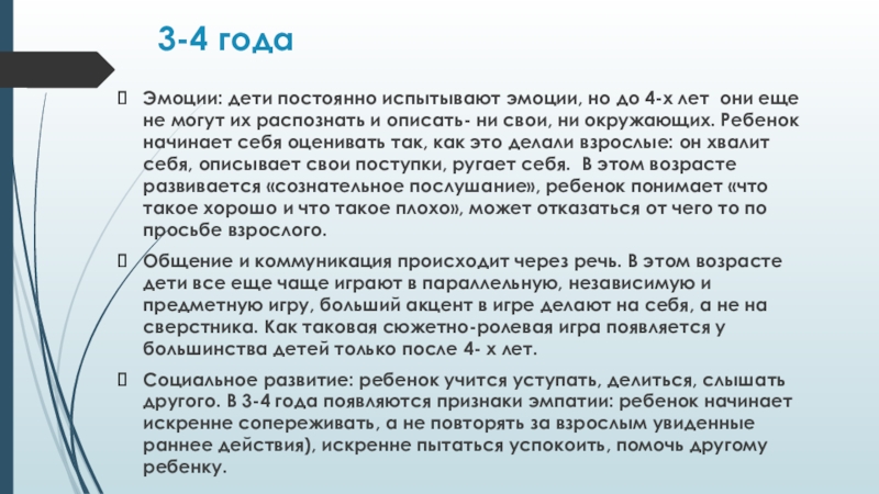еще не могут их распознать и описать- ни свои, ни окружающих. Ребенок начинает себя оценивать так, как это делали взрослые: он хвалит себя, описывает свои поступки, ругает себя. В этом возрасте развивается «сознательное послушание», ребенок понимает «что такое хорошо и что такое плохо», может отказаться от чего то по просьбе взрослого.