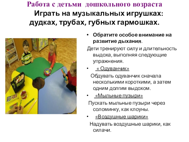 Дети тренируют силу и длительность выдоха, выполняя следующие упражнения.