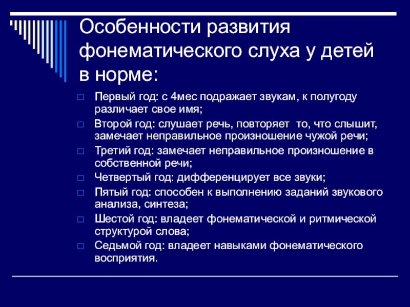 Слайд 5Особенности развития фонематического слуха у детей в норме: