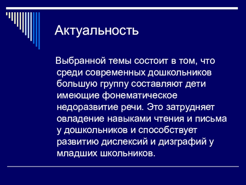 дошкольников большую группу составляют дети имеющие фонематическое недоразвитие речи. Это затрудняет овладение навыками чтения и письма у дошкольников и способствует развитию дислексий и дизграфий у младших школьников.