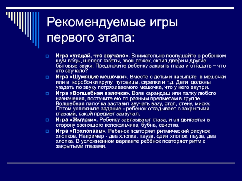 Слайд 7Рекомендуемые игры первого этапа: