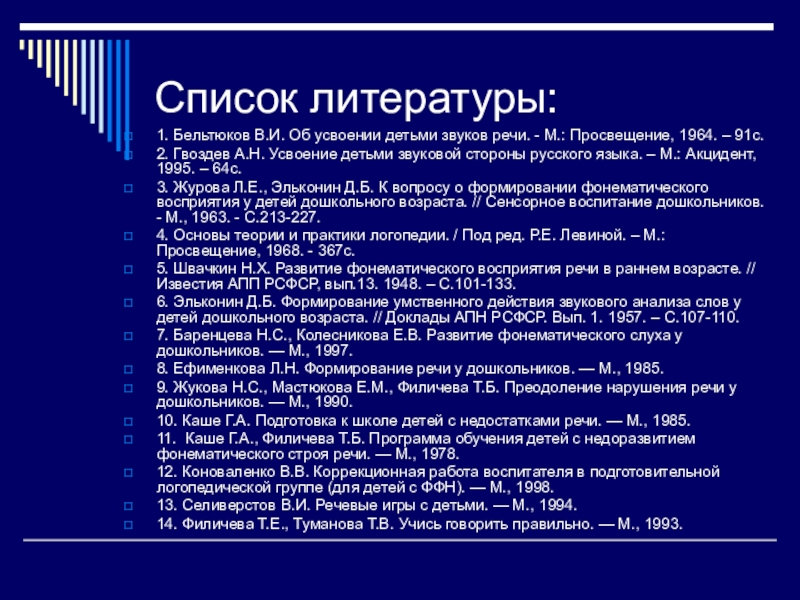 1. Бельтюков В.И. Об усвоении детьми звуков речи. - М.: