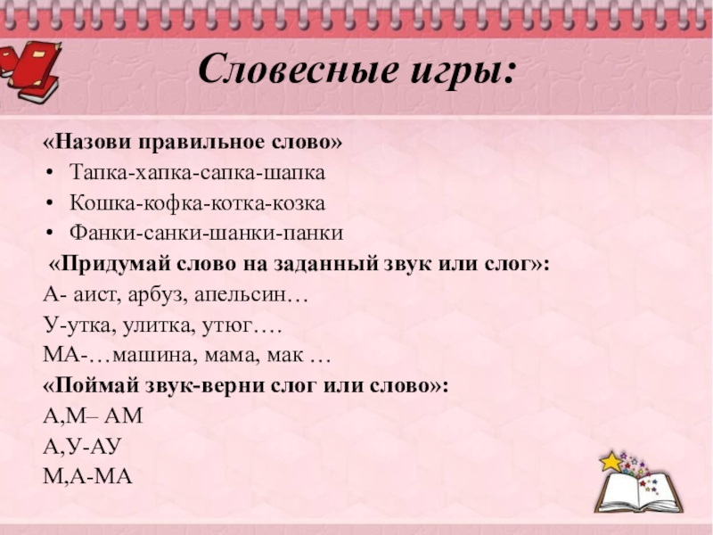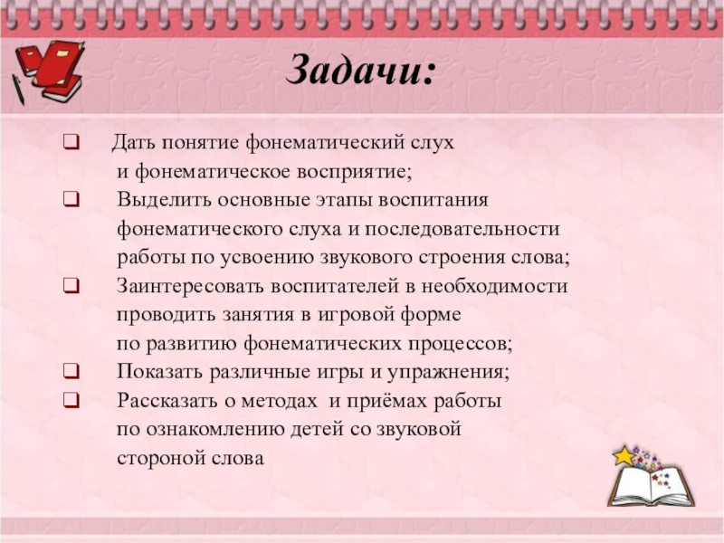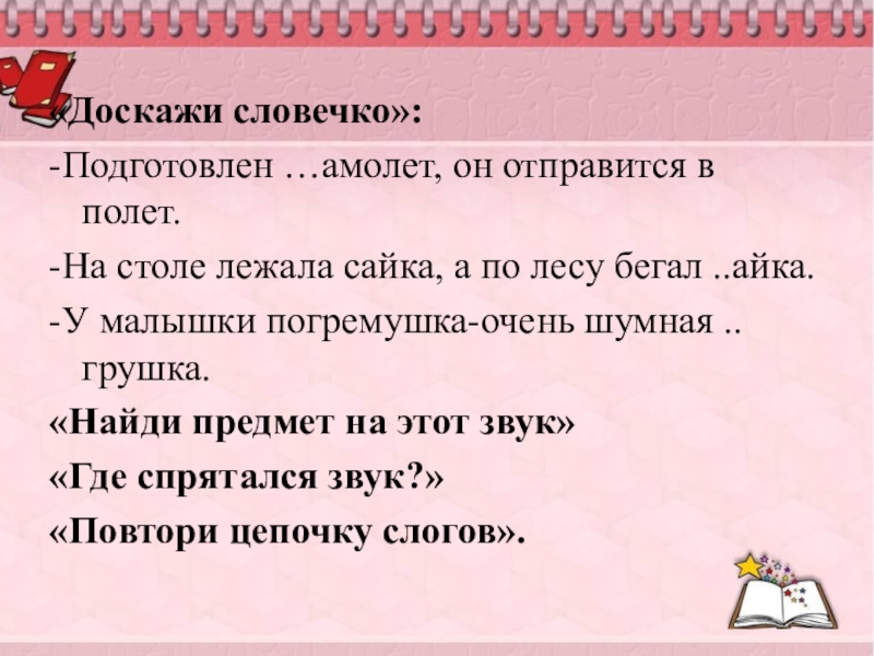часть слова, составлять слова из слогов, определять последовательное звучание слогов в слове, развивать умение выделять звуки, входящие в состав слога, находить и вычленять ударный слог, последовательно называть звуки в слове, выполнять звуковой анализ простых слов, умение называть слова с определённым звуком, в предложении находить слова с этим звуком, определять место звука в слове и т.д.