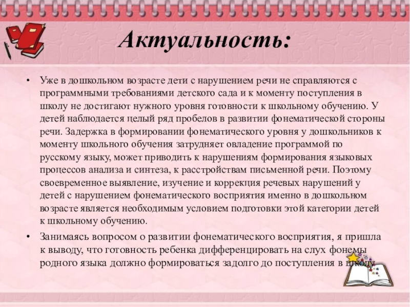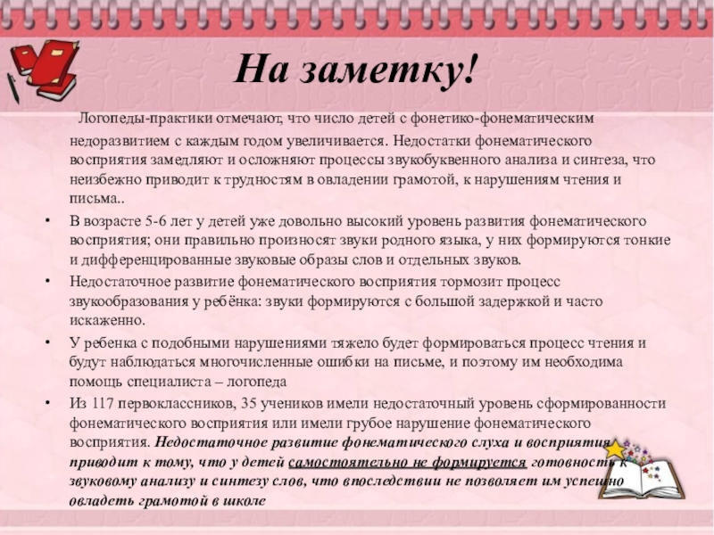 каждым годом увеличивается. Недостатки фонематического восприятия замедляют и осложняют процессы звукобуквенного анализа и синтеза, что неизбежно приводит к трудностям в овладении грамотой, к нарушениям чтения и письма..