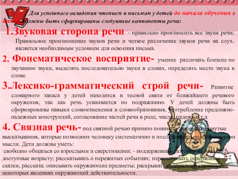 овладения чтением и письмом у детей до начала обучения в школе должны быть сформированы следующие компоненты речи: