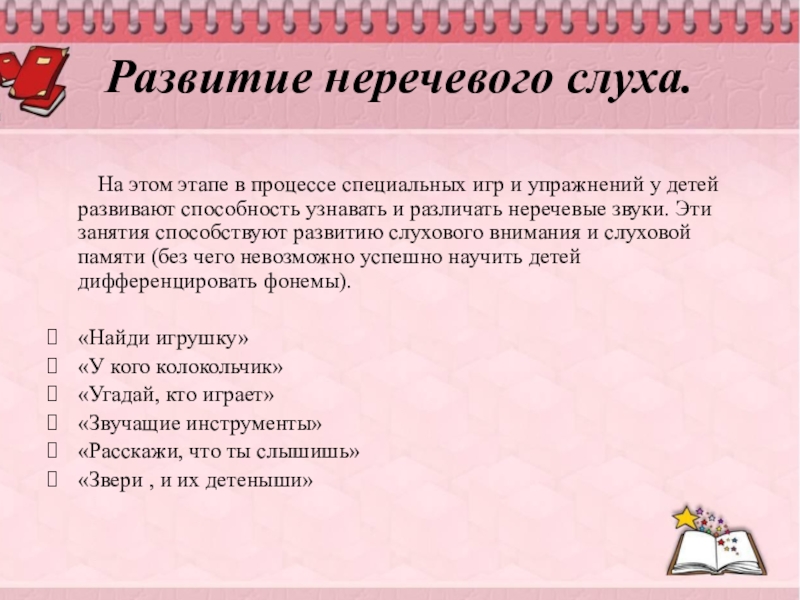процессе специальных игр и упражнений у детей развивают способность узнавать и различать неречевые звуки. Эти занятия способствуют развитию слухового внимания и слуховой памяти (без чего невозможно успешно научить детей дифференцировать фонемы).