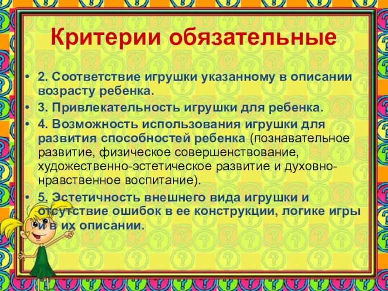 4. Возможность использования игрушки для развития способностей ребенка (познавательное развитие, физическое совершенствование, художественно-эстетическое развитие и духовно-нравственное воспитание).