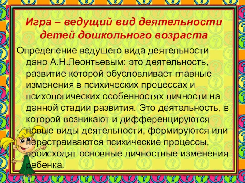 дано А.Н.Леонтьевым: это деятельность, развитие которой обусловливает главные изменения в психических процессах и психологических особенностях личности на данной стадии развития. Это деятельность, в которой возникают и дифференцируются новые виды деятельности, формируются или перестраиваются психические процессы, происходят основные личностные изменения ребенка.