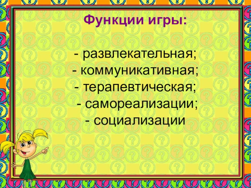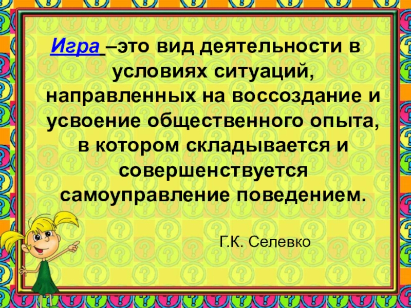 Слайд 5Игра –это вид деятельности в условиях ситуаций, направленных на воссоздание и
