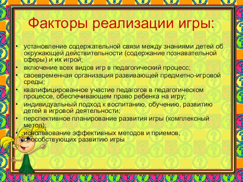 квалифицированное участие педагогов в педагогическом процессе, обеспечивающем право ребенка на игру;