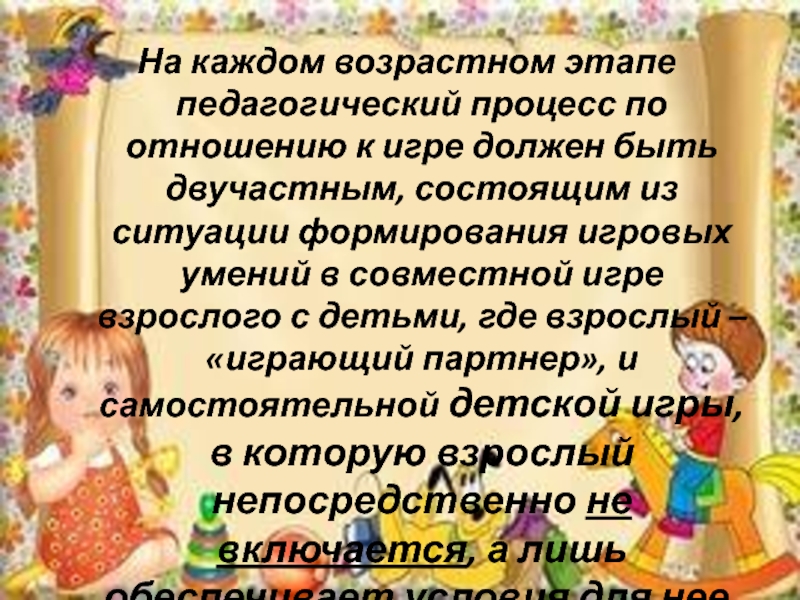 Слайд 21На каждом возрастном этапе педагогический процесс по отношению к игре должен