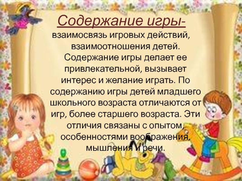 вызывает интерес и желание играть. По содержанию игры детей младшего школьного возраста отличаются от игр, более старшего возраста. Эти отличия связаны с опытом, особенностями воображения, мышления и речи.