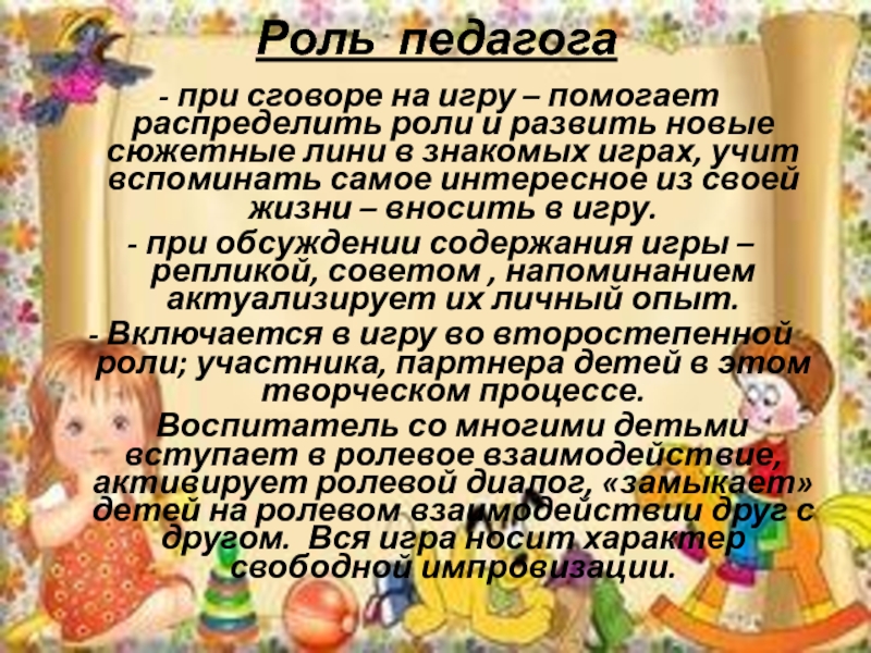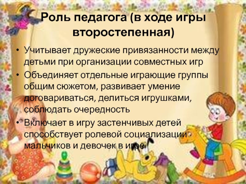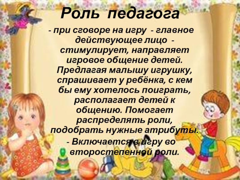 Слайд 20Роль педагога (в ходе игры второстепенная)