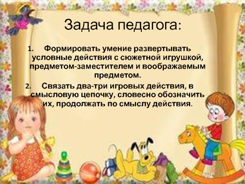 Формировать умение развертывать условные действия с сюжетной игрушкой, предметом-заместителем и