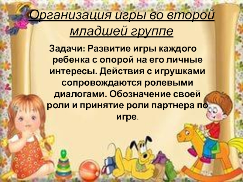 с опорой на его личные интересы. Действия с игрушками сопровождаются ролевыми диалогами. Обозначение своей роли и принятие роли партнера по игре.