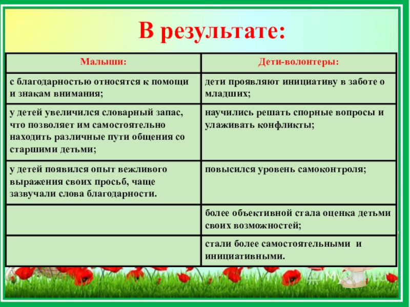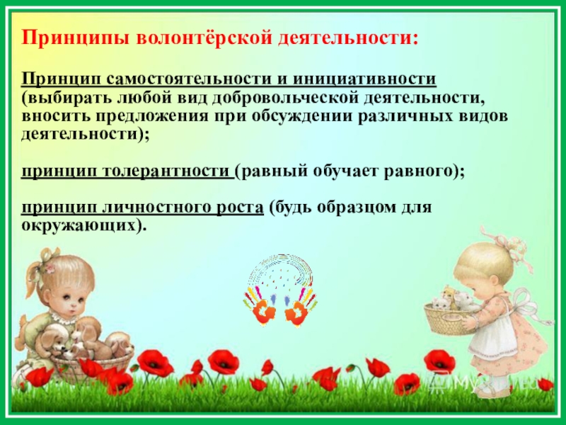 Волонтерство - это прежде всего инициатива. У детей начинает формироваться активная жизненная позиция, желание и умение по возможности помогать тем, кто нуждается в помощи, получая взамен внутреннее удовлетворение.