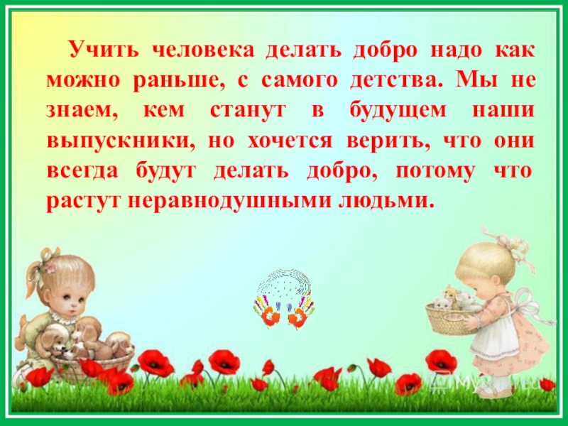 Слайд 24 Учить человека делать добро надо как можно раньше, с самого