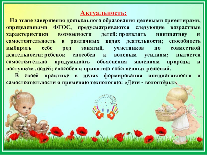 В своей практике в целях формирования инициативности и самостоятельности я применяю технологию: «Дети - волонтёры».