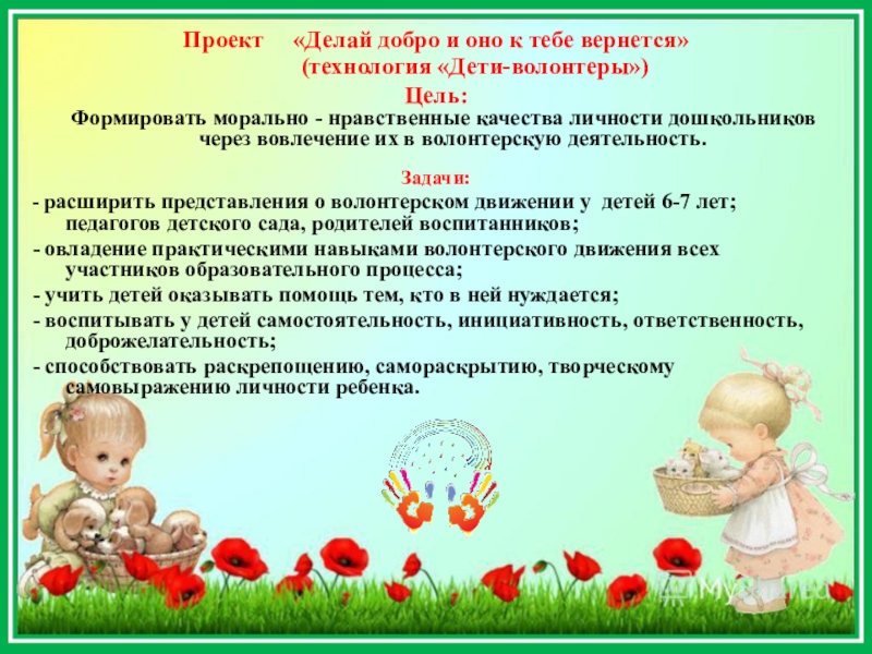 - расширить представления о волонтерском движении у детей 6-7 лет; педагогов детского сада, родителей воспитанников;