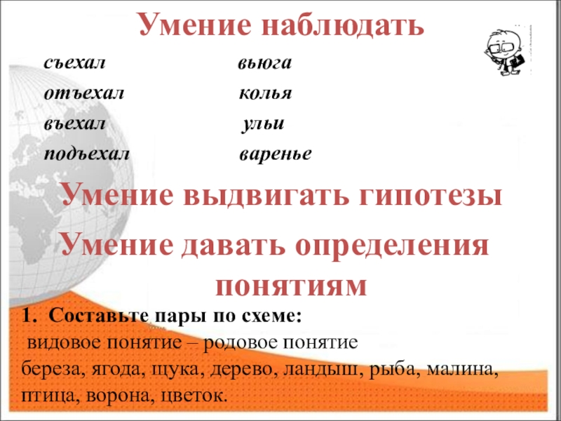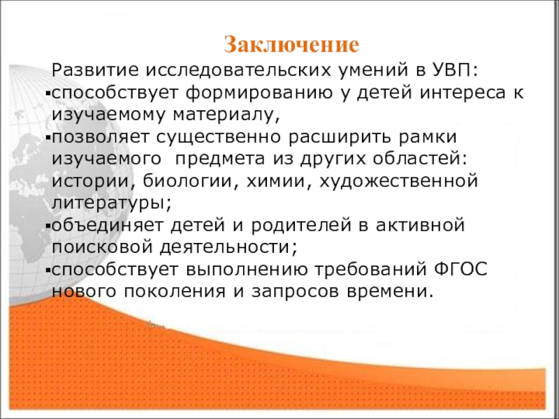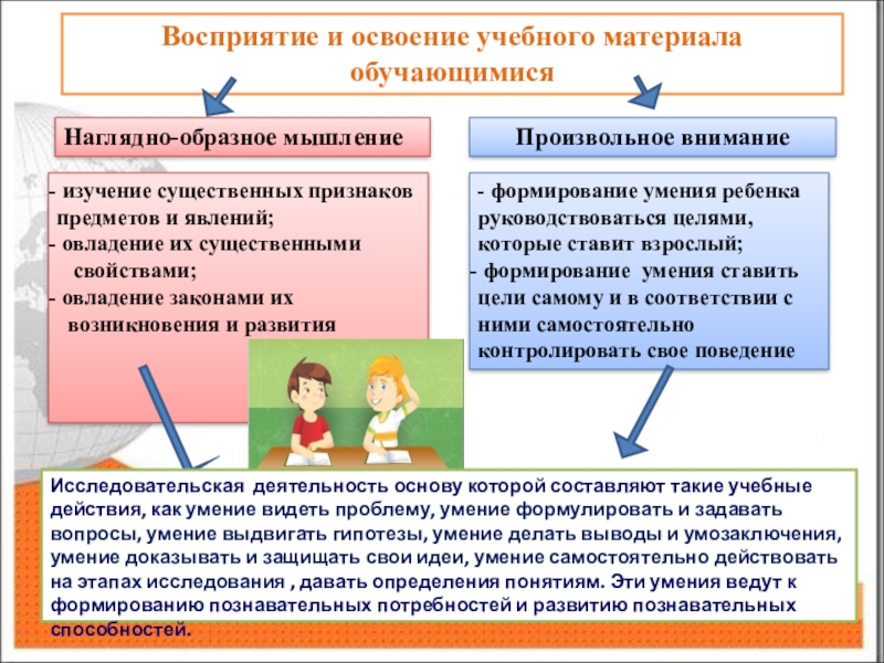Исследовательская деятельность основу которой составляют такие учебные действия, как умение видеть проблему, умение формулировать и задавать вопросы, умение выдвигать гипотезы, умение делать выводы и умозаключения, умение доказывать и защищать свои идеи, умение самостоятельно действовать на этапах исследования , давать определения понятиям. Эти умения ведут к формированию познавательных потребностей и развитию познавательных способностей.