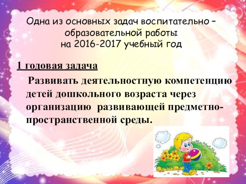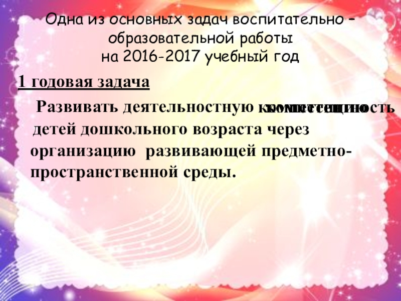 Развивать деятельностную компетенцию детей дошкольного возраста через организацию развивающей предметно-пространственной среды.