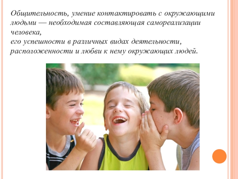 Слайд 2Общительность, умение контактировать с окружающими людьми — необходимая составляющая самореализации человека,