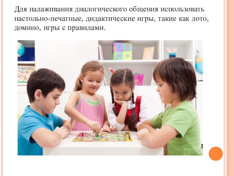 Слайд 10Для налаживания диалогического общения использовать настольно-печатные, дидактические игры, такие как лото,
