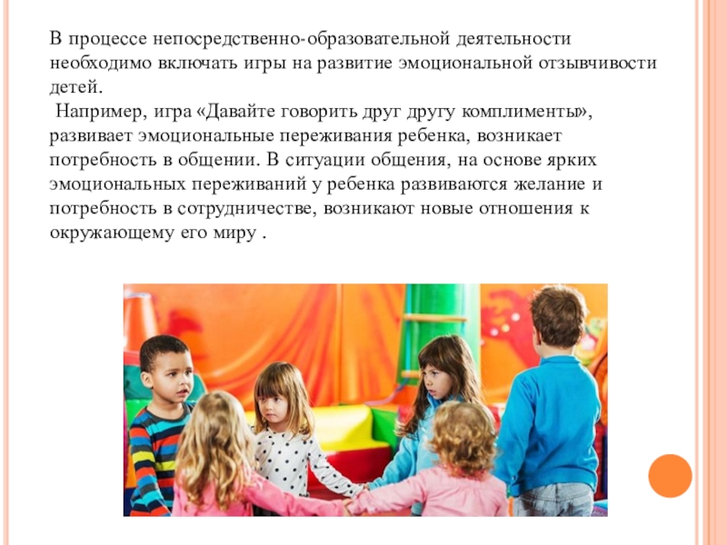 Слайд 9В процессе непосредственно-образовательной деятельности необходимо включать игры на развитие эмоциональной отзывчивости
