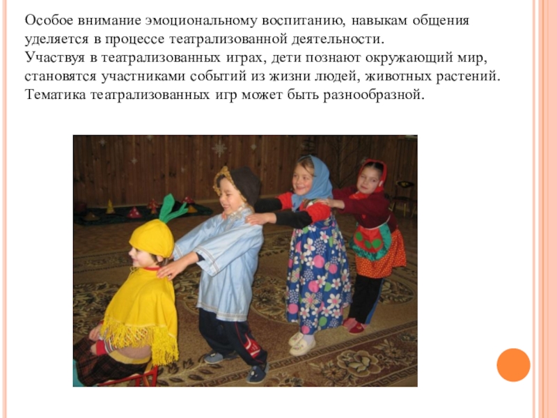Слайд 16Особое внимание эмоциональному воспитанию, навыкам общения уделяется в процессе театрализованной деятельности.