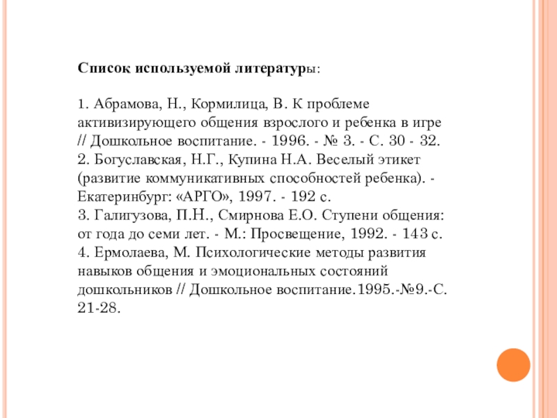 4. Ермолаева, М. Психологические методы развития навыков общения и эмоциональных состояний дошкольников // Дошкольное воспитание.1995.-№9.-С. 21-28.