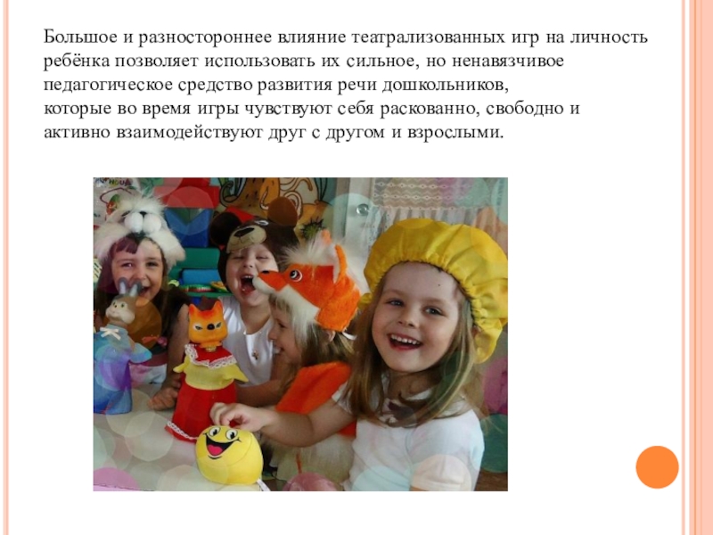 Слайд 17Большое и разностороннее влияние театрализованных игр на личность ребёнка позволяет использовать