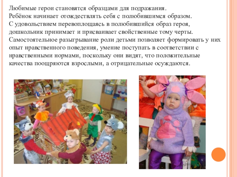 С удовольствием перевоплощаясь в полюбившийся образ героя, дошкольник принимает и присваивает свойственные тому черты. Самостоятельное разыгрывание роли детьми позволяет формировать у них опыт нравственного поведения, умение поступать в соответствии с нравственными нормами, поскольку они видят, что положительные качества поощряются взрослыми, а отрицательные осуждаются.