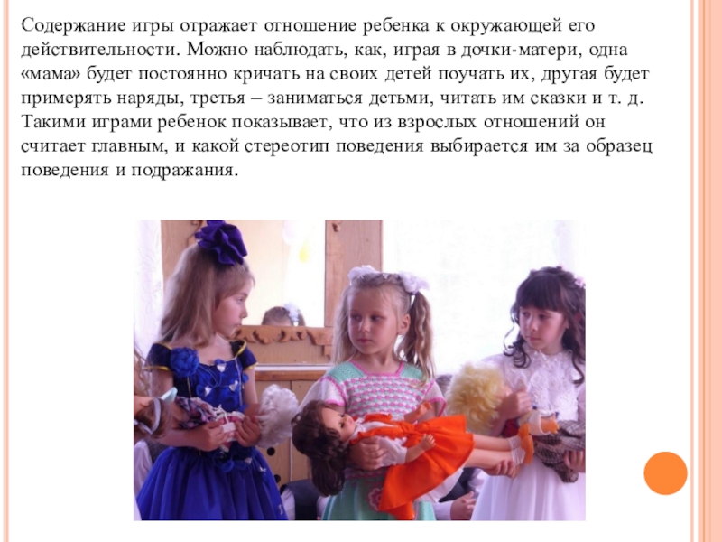 как, играя в дочки-матери, одна «мама» будет постоянно кричать на своих детей поучать их, другая будет примерять наряды, третья – заниматься детьми, читать им сказки и т. д.