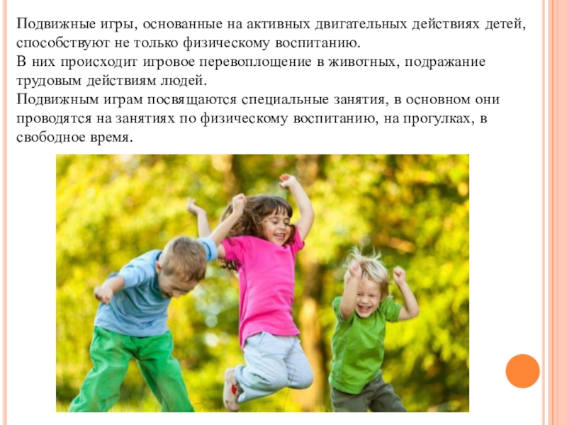 Слайд 11Подвижные игры, основанные на активных двигательных действиях детей, способствуют не только