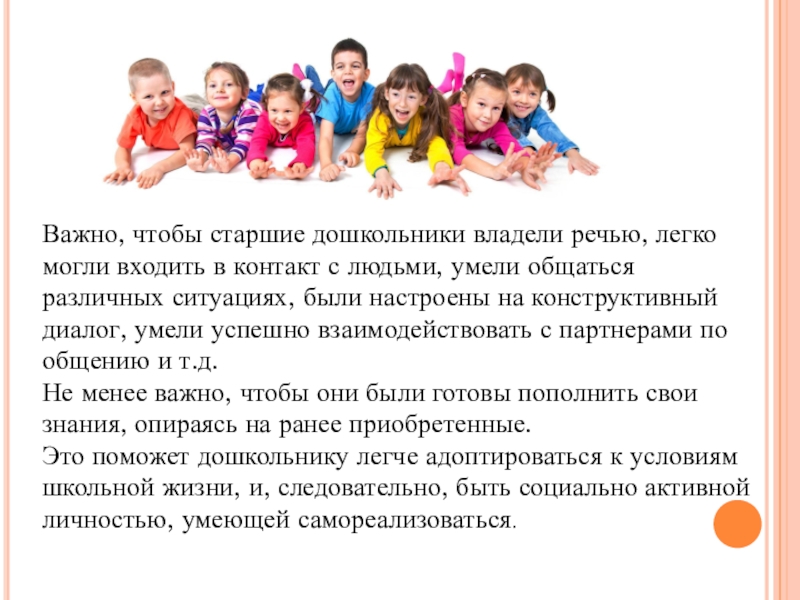 Слайд 19Важно, чтобы старшие дошкольники владели речью, легко могли входить в контакт