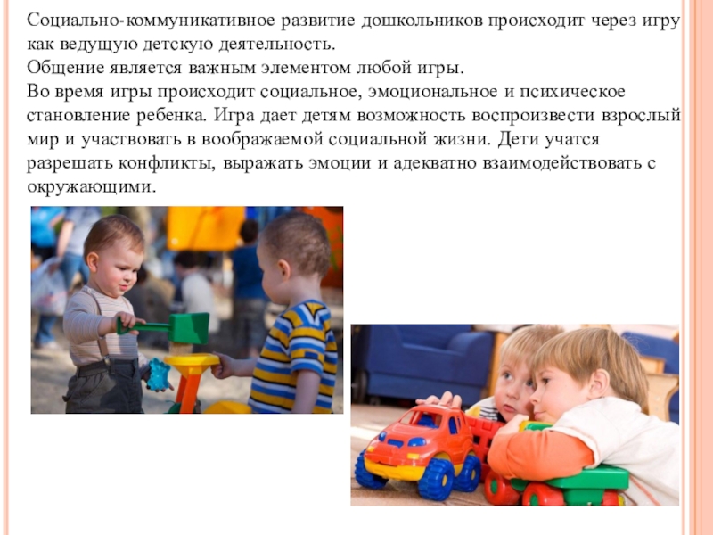 Слайд 7Социально-коммуникативное развитие дошкольников происходит через игру как ведущую детскую деятельность.