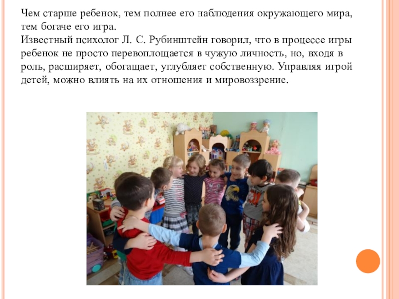 Известный психолог Л. С. Рубинштейн говорил, что в процессе игры ребенок не просто перевоплощается в чужую личность, но, входя в роль, расширяет, обогащает, углубляет собственную. Управляя игрой детей, можно влиять на их отношения и мировоззрение.
