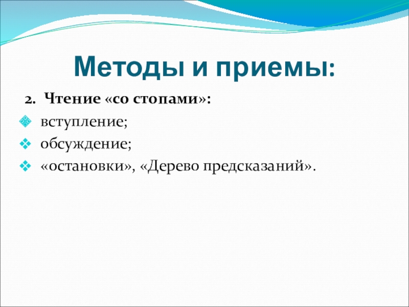 Методы и приемы:2. Чтение «со стопами»: вступление; обсуждение; «остановки», «Дерево предсказаний».