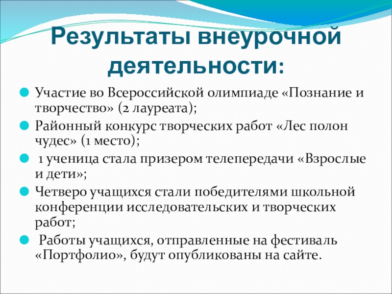 Результаты внеурочной деятельности:Участие во Всероссийской олимпиаде «Познание и творчество» (2 лауреата);Районный конкурс творческих работ «Лес полон чудес»