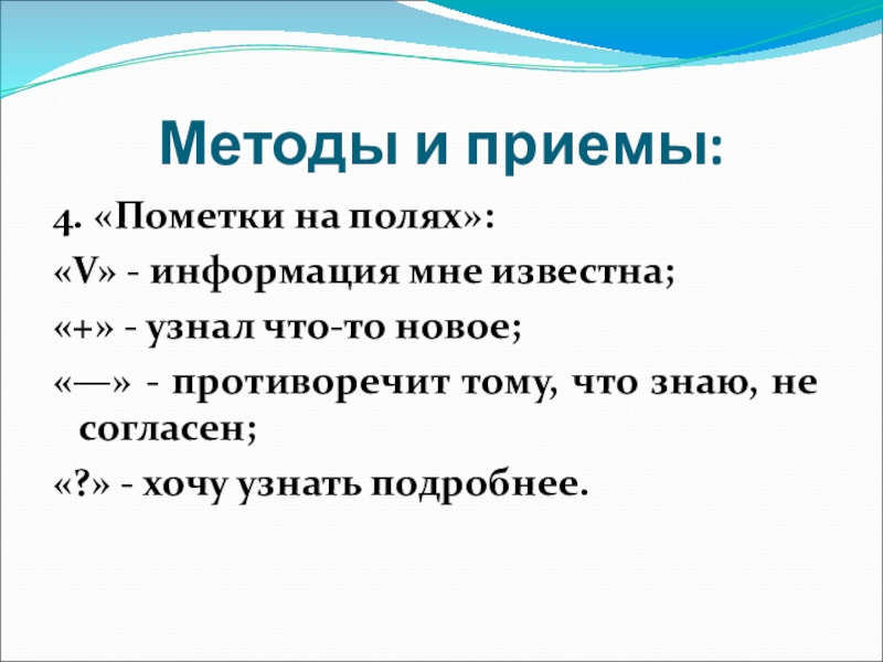 Методы и приемы:4. «Пометки на полях»:«V» - информация мне известна;«+» - узнал что-то новое;«—» - противоречит тому,