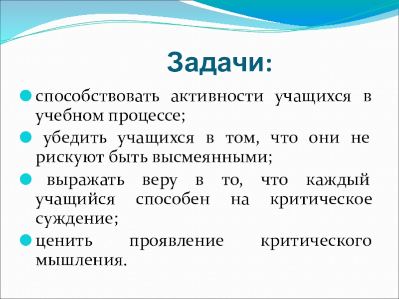 Задачи:способствовать активности учащихся в учебном процессе; убедить учащихся в том, что они не рискуют быть высмеянными; выражать