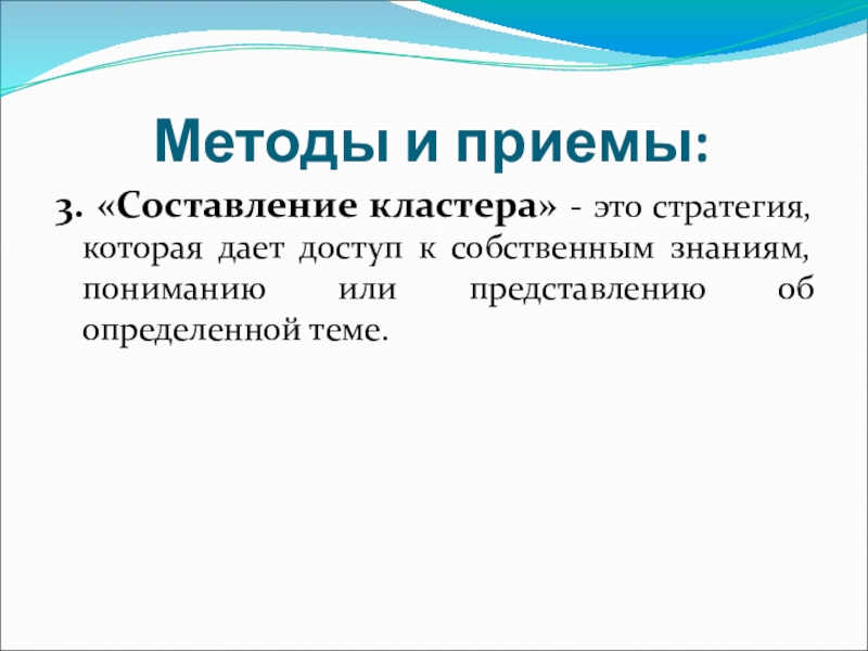 Методы и приемы:3. «Составление кластера» - это стратегия, которая дает доступ к собственным знаниям, пониманию или представлению