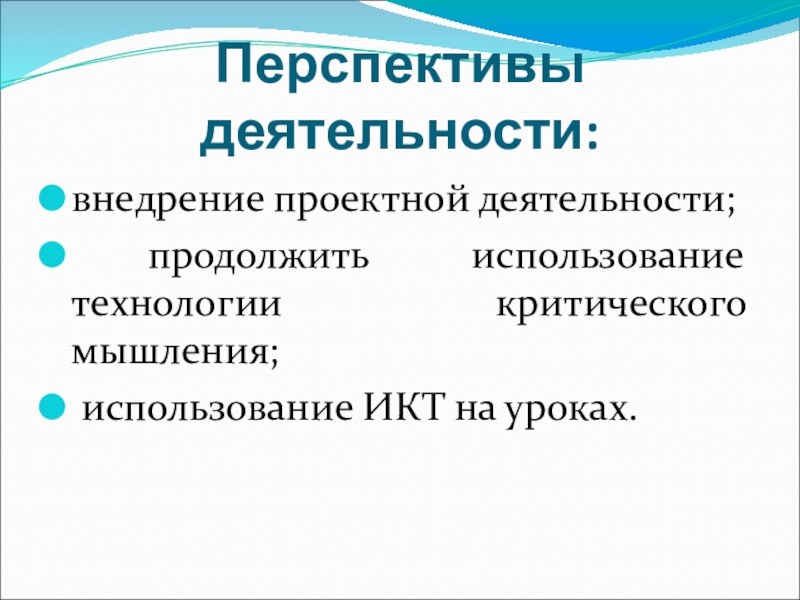 Перспективы деятельности:внедрение проектной деятельности; продолжить использование технологии критического мышления; использование ИКТ на уроках.