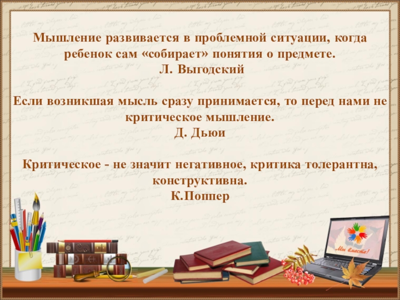 Мышление развивается в проблемной ситуации, когда ребенок сам «собирает» понятия о