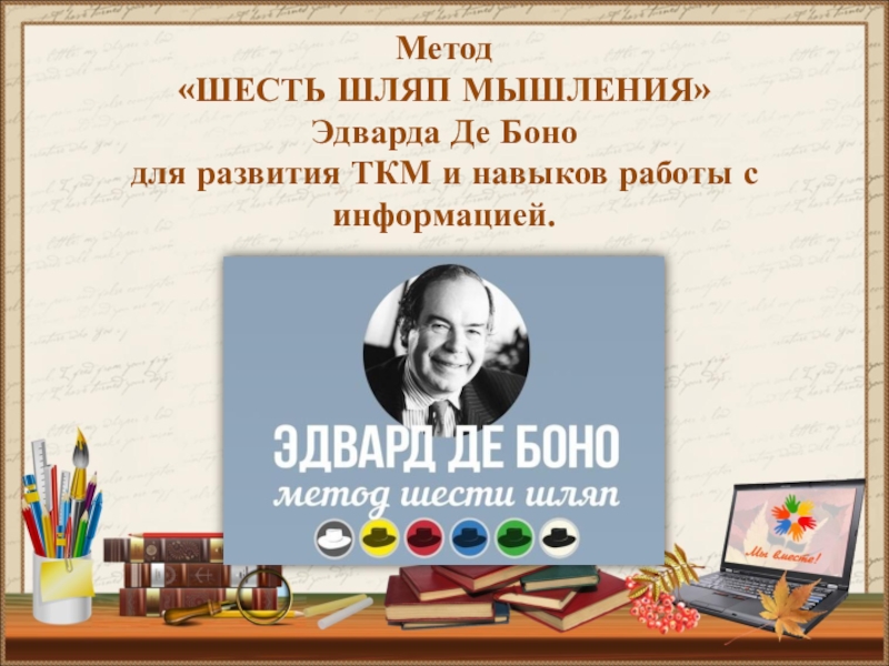 https://www.trizway.com/art/form/348.html МЕТОД «ШЕСТЬ ШЛЯП МЫШЛЕНИЯ» ЭДВАРДА ДЕ БОНО ДЛЯ РАЗВИТИЯ НАВЫКОВ РАБОТЫ С ИНФОРМАЦИЕй