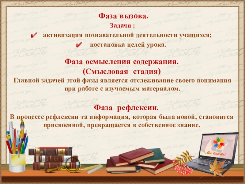 Главной задачей этой фазы является отслеживание своего понимания при работе с изучаемым материалом.