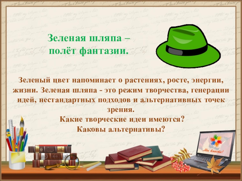 Зеленый цвет напоминает о растениях, росте, энергии, жизни. Зеленая шляпа -