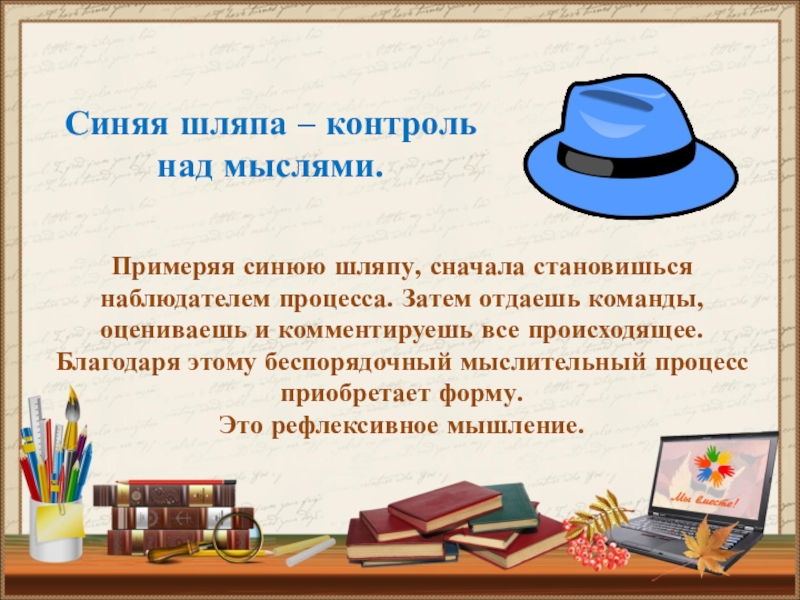 Слайд 41Примеряя синюю шляпу, сначала становишься наблюдателем процесса. Затем отдаешь команды, оцениваешь