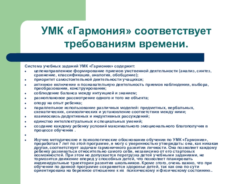 Изучив методические и психологические обоснования обучения по УМК «Гармония», проработав 7 лет по этой программе, я могу с уверенностью утверждать: она, как никакая другая, соответствует задачам гармоничного развития личности. Она позволяет каждому ребенку развиваться относительно самого себя, независимо от его стартовых возможностей. При этом не допускается перегрузка детей учебными заданиями, не тормозится движение вперед у способных детей, что позволяет планировать индивидуальные траектории развития школьников. Кроме этого, очень важно, что при обучении по данной программе сохраняется здоровье детей, так как она по сути ориентирована на бережное отношение к их психическому и физическому состоянию..