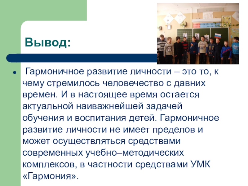 с давних времен. И в настоящее время остается актуальной наиважнейшей задачей обучения и воспитания детей. Гармоничное развитие личности не имеет пределов и может осуществляться средствами современных учебно–методических комплексов, в частности средствами УМК «Гармония».